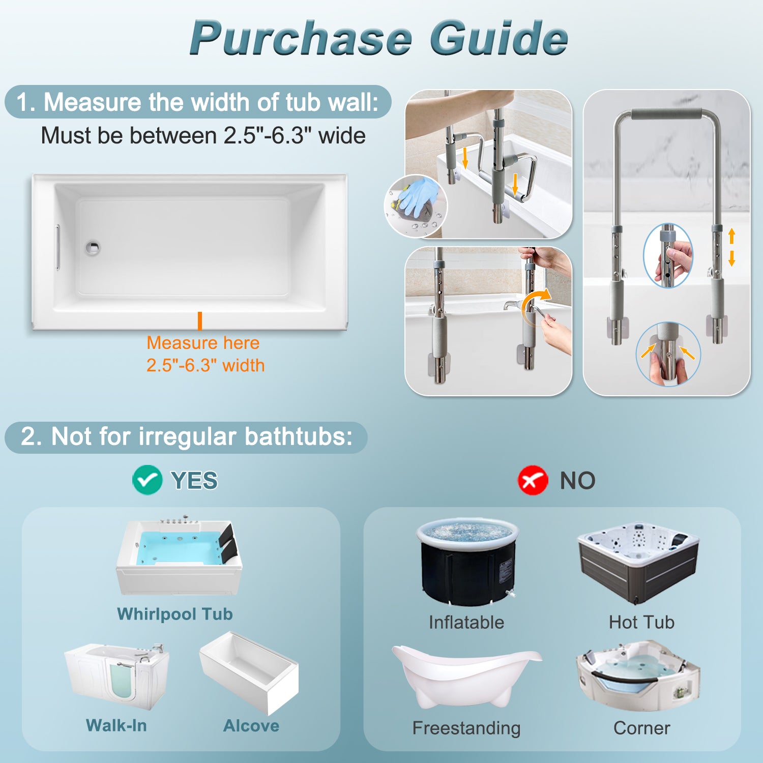 - 【Clamp on Tub Rail】Bathtub grab bar designed with a large clamp area, can be firmly fixed on the bathtub without fear of slipping out. No drilling required and no damage to your tub. The clamp has a width adjustment range of 2.5-6.3 inch and fits most standard tubs. [Not for fiberglass tub]
