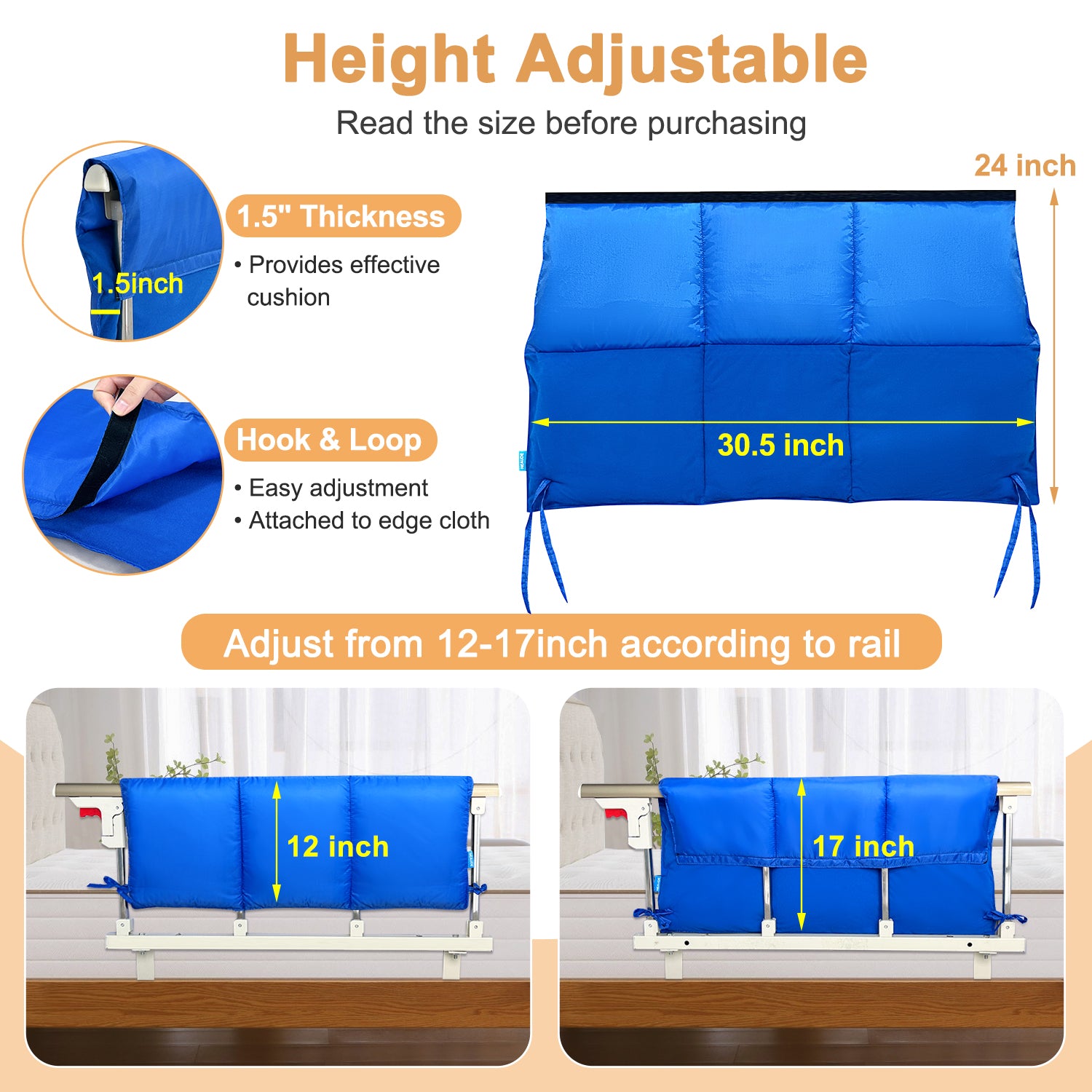 - 【Unique Design】The design of Velcro makes the height of the bed railing pad adjustable from 12-17 inches. Applied to most short bed rail with gaps, such as home care bed rail, hospital bed bumper, college dorm bed rail and etc.
